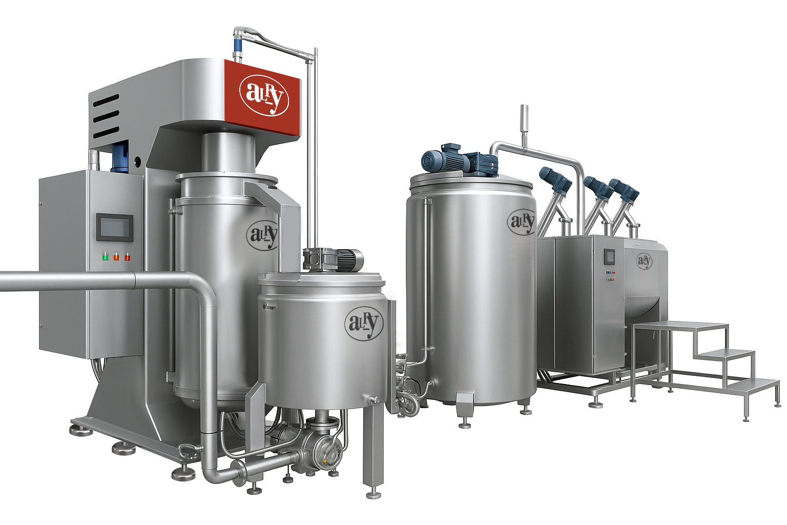 ALPY Choco-Line 500/P modeli, pudra şeker bazlı ürünler için 400-500 kg/saat son ürün kapasitesine sahiptir, 500 kg/şarj kapasiteli hazırlama mikseri, 1000 lt kapasiteli servis tankı ve ACB-500 Model Conti Bilyalı Değirmen içerir.